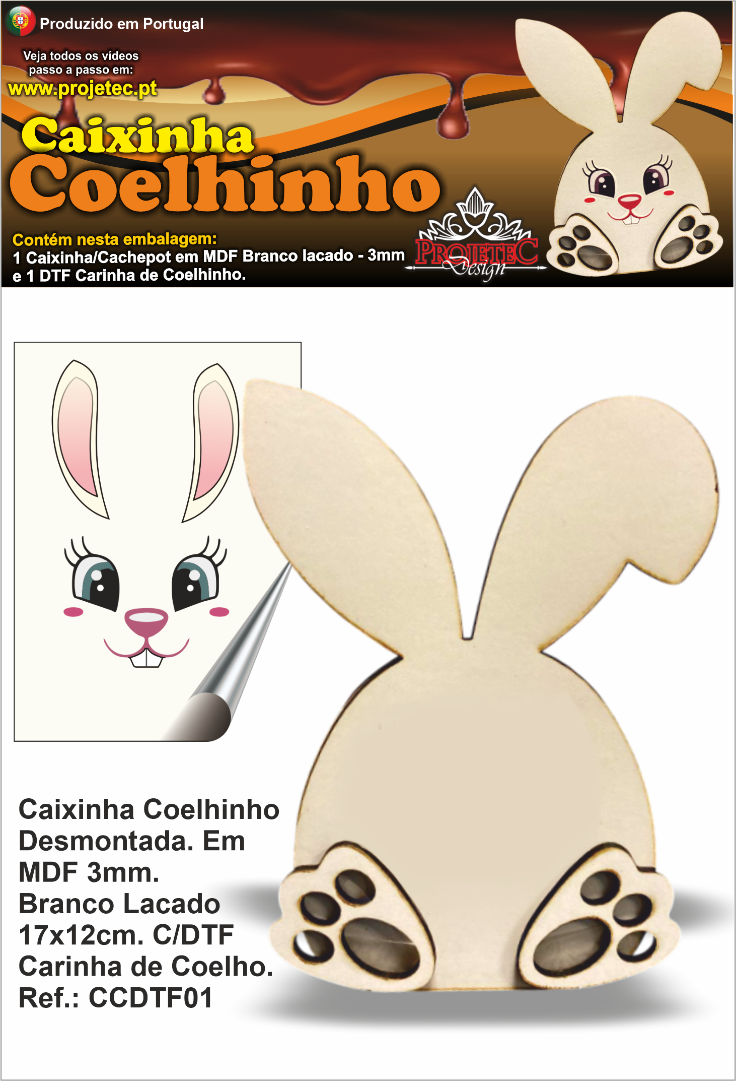 CAIXINHA COELHINHO COM DTF CARINHA DE COELHO – MDF 3MM. BRANCO LACADO – 17X12CM. REF.: CCDTF01