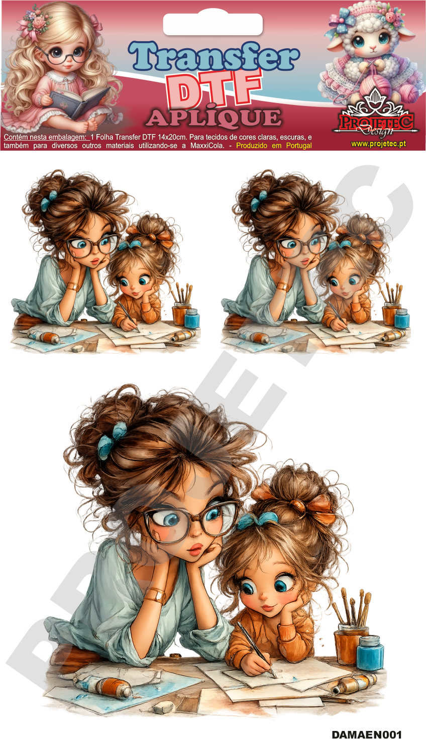 Transfer DTF, é uma nova tecnologia de transferência de imagem para tecidos de qualquer tipo e cor, e agora também pode ser utilizado e retirado à frio, com  a MaxxiCola  e impermeabilizado com o Verniz VitraLux, ambos da Projetec Design.  Pode também ser utilizado em madeira, MDF Cru ou lacado de qualquer cor.  Transferência rápida por calor, com a utilização de ferro de engomar ou prensa térmica.  Rápida transferência sem a necessidade de acabamentos posteriores.