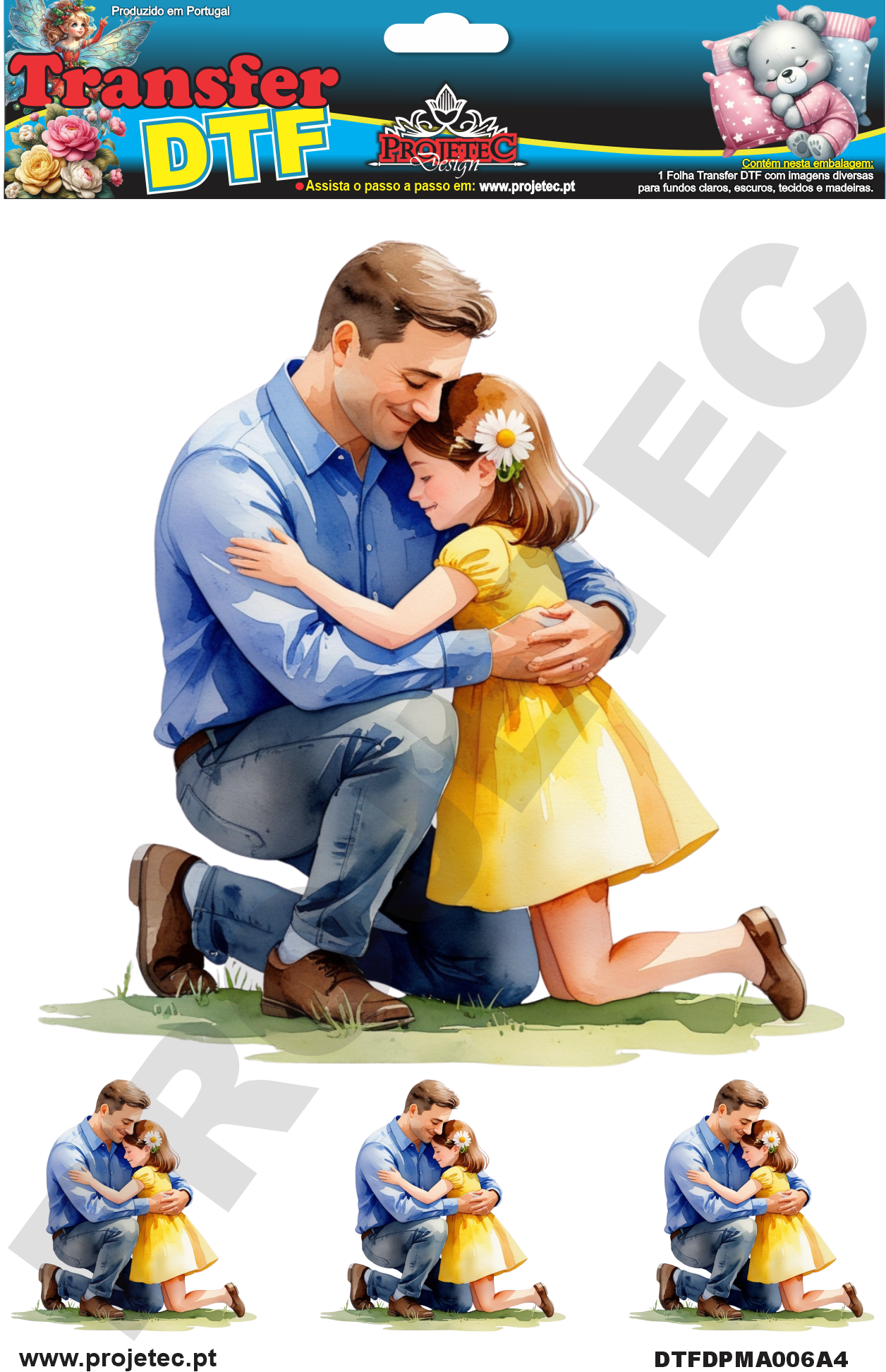 Transfer DTF, é uma nova tecnologia de transferência de imagem para tecidos de qualquer tipo e cor, e agora também pode ser utilizado e retirado à frio, com  a MaxxiCola  e impermeabilizado com o Verniz VitraLux, ambos da Projetec Design.  Pode também ser utilizado em madeira, MDF Cru ou lacado de qualquer cor.  Transferência rápida por calor, com a utilização de ferro de engomar ou prensa térmica.  Rápida transferência sem a necessidade de acabamentos posteriores.